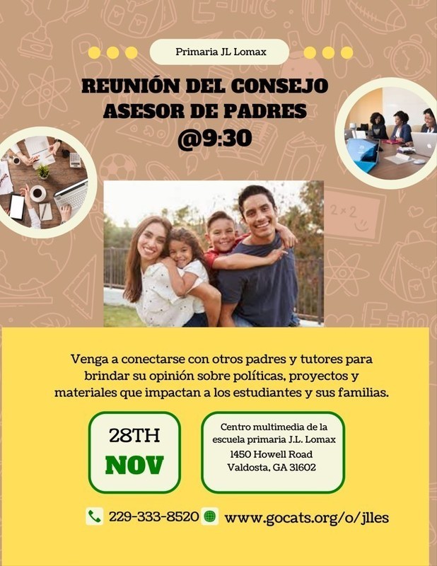 Estamos muy emocionados de tener nuestra primera reunión del Consejo Asesor de Padres el 28 de noviembre a las 9:30. Todos los padres están invitados a asistir.